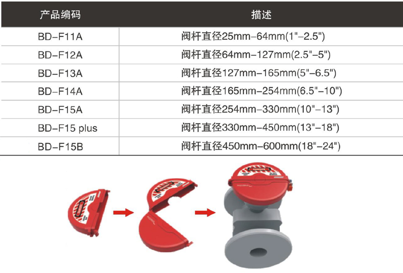 b.采用不同大小半圆设计,储存或携带时可合为一体,减少一半体积。专用于锁定手轮直径为25mm~450mm的闸阀