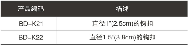 c.提供直径为1"(2.5cm)和1.5"(3.8cm)的钩扣